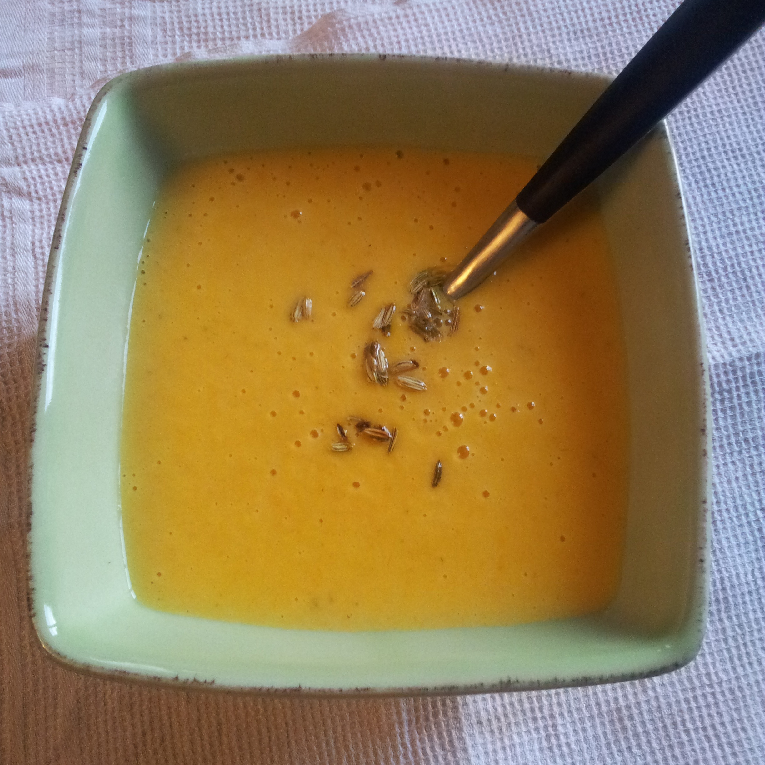 Décorez chaque assiette de ce velouté de quelques graines de cumin dorée et dégustez.