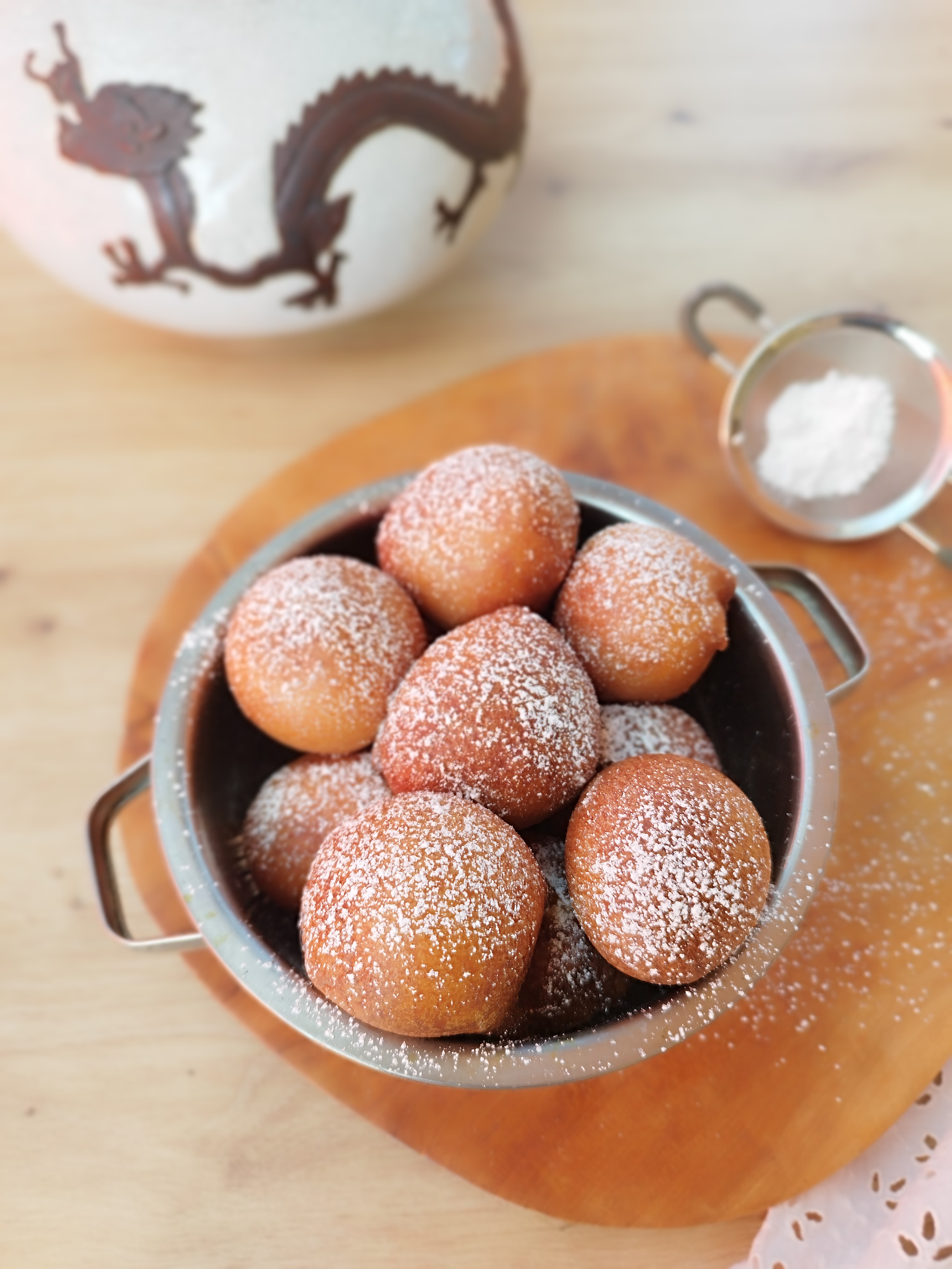 - Dans un sauteuse à bords hauts, faites chauffer l’huile de friture. Quand elle est bien chaude (160 à 180°C.), plongez-y des petites boules de pâte (aidez vous d’une cuillère à glace!). Laissez cuire quelques minutes jusqu’à une jolie coloration dorée.
