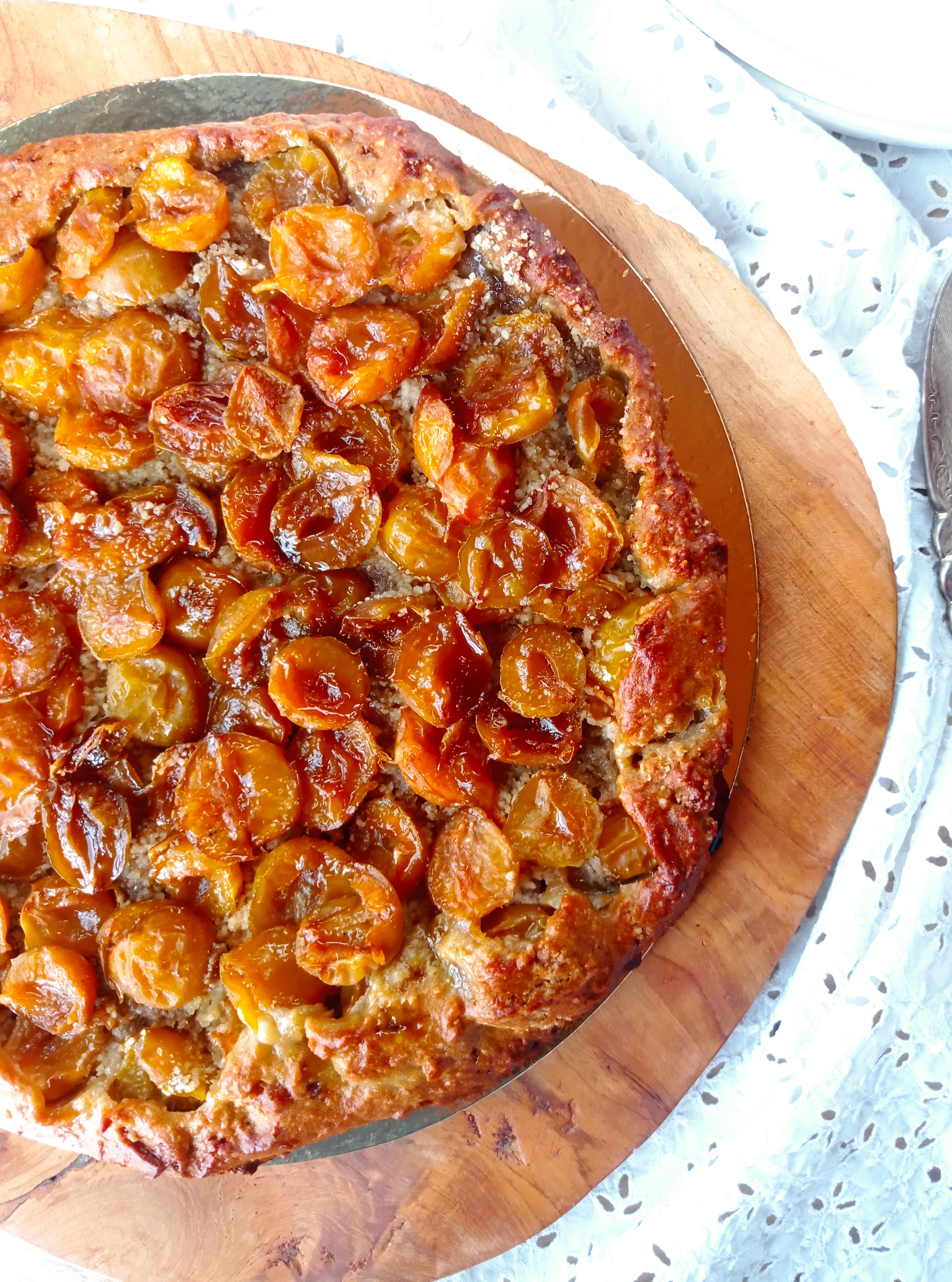 Cette tarte est exclusivement sans produits laitiers et est pauvre en gluten puisque la pâte est composée de farine de petit épeautre (variété de blé ancien) et de poudre d’amandes.