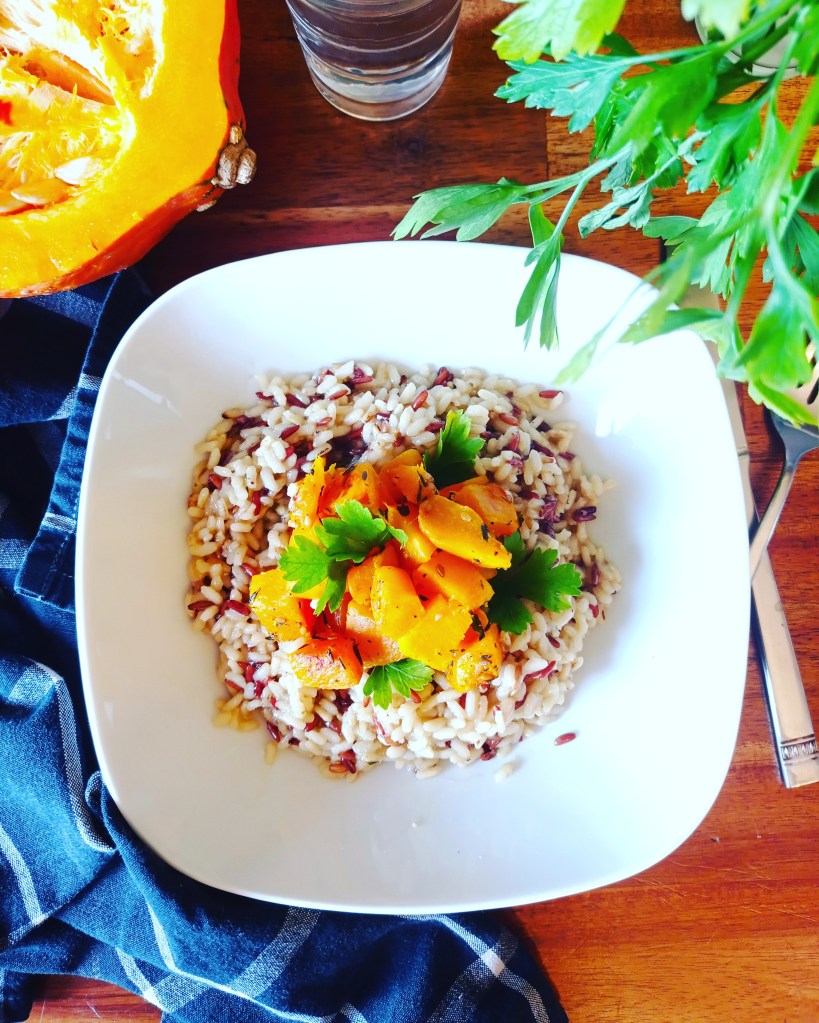 Alors que l’on se retrouve de nouveau confinés et que cela revêt un goût amer pour nombre d’entre nous, je vous propose de faire entrer de la douceur dans vos foyers avec ce plat 100% comfort food, un risotto fondant comme on l’aime accompagné d’un des légumes fruits emblématiques de l’automne.