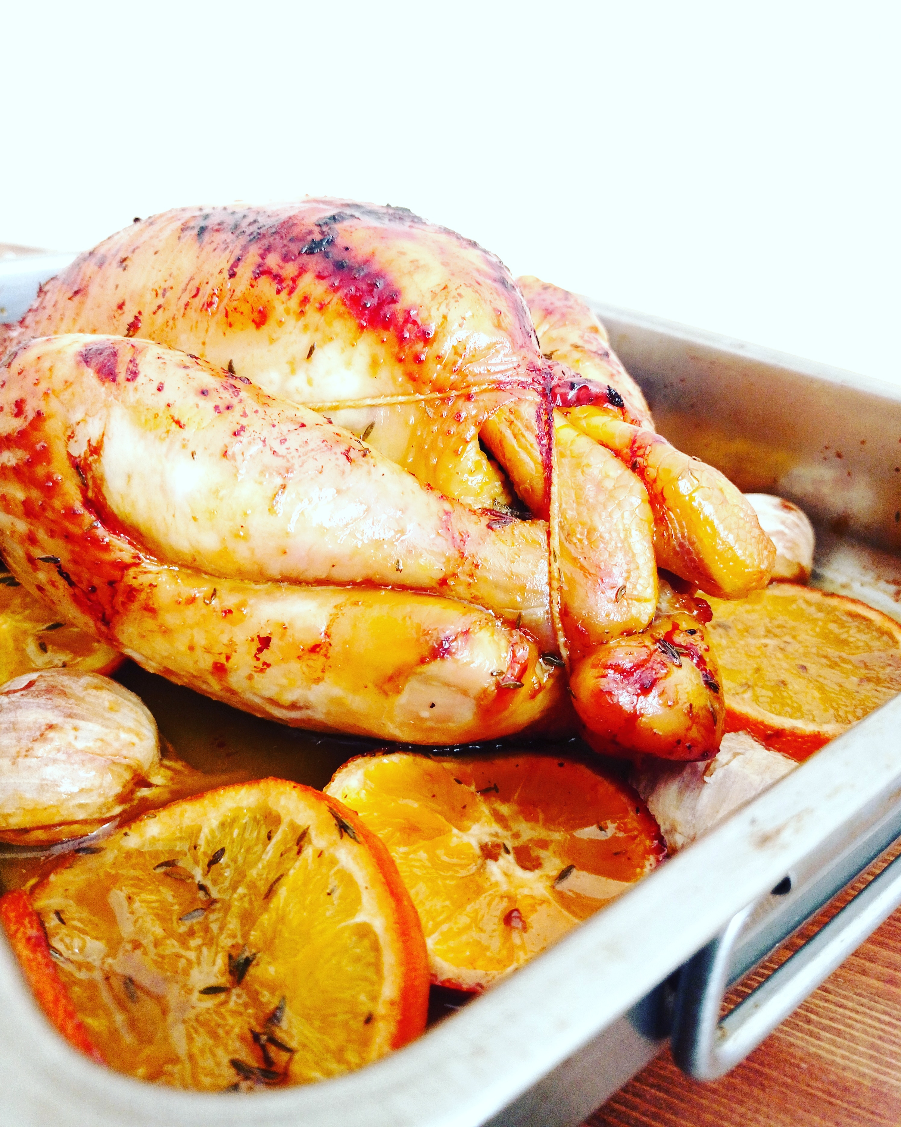 - Coupez des rondelles dans la 2ème orange et disposez-les dans le plat avec les gousses d’ail entières.
