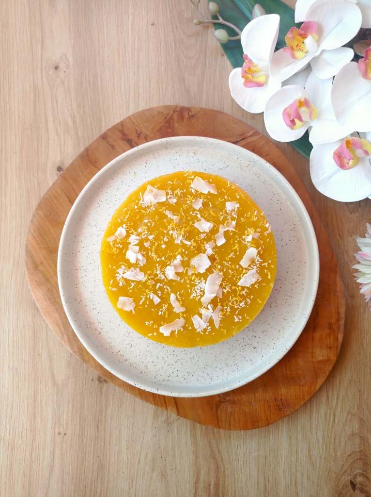 - Réalisez enfin la gelée de mangue: épluchez et détaillez la mangue en morceaux. Mixez-la. Mélangez l’agar-agar avec un peu de mangue mixée. Dans une casserole sur feu moyen, mélangez ensemble la mangue mixée, le miel et l’agar-agar. Laissez cuire 2 minutes à partir de l’ébullition. Versez sur la panna cotta de coco figée. Décorez avec de la noix de coco râpée, en copeaux et le zeste finement râpé d’un citron.