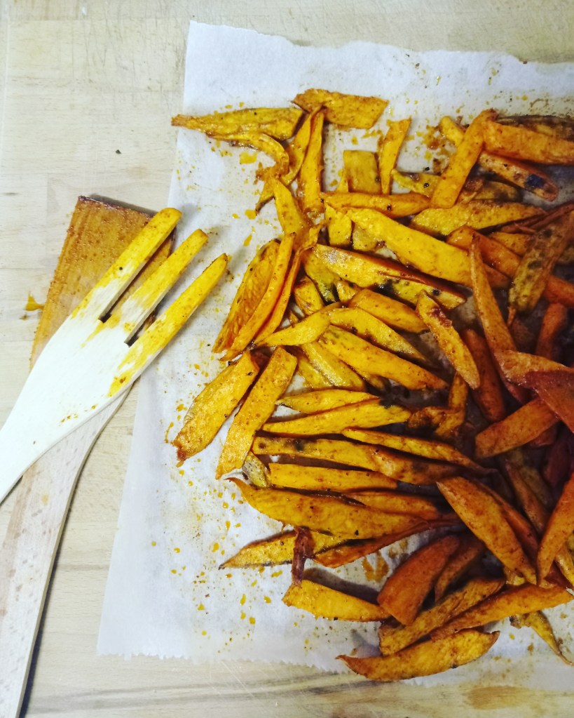 Aujourd’hui, ce n’est pas vraiment une recette que je vous propose ici, mais plutôt la façon dont je procède pour réaliser des frites de patates douces. C’est hyper simple et rapide à faire, trop trop bon et de saison.