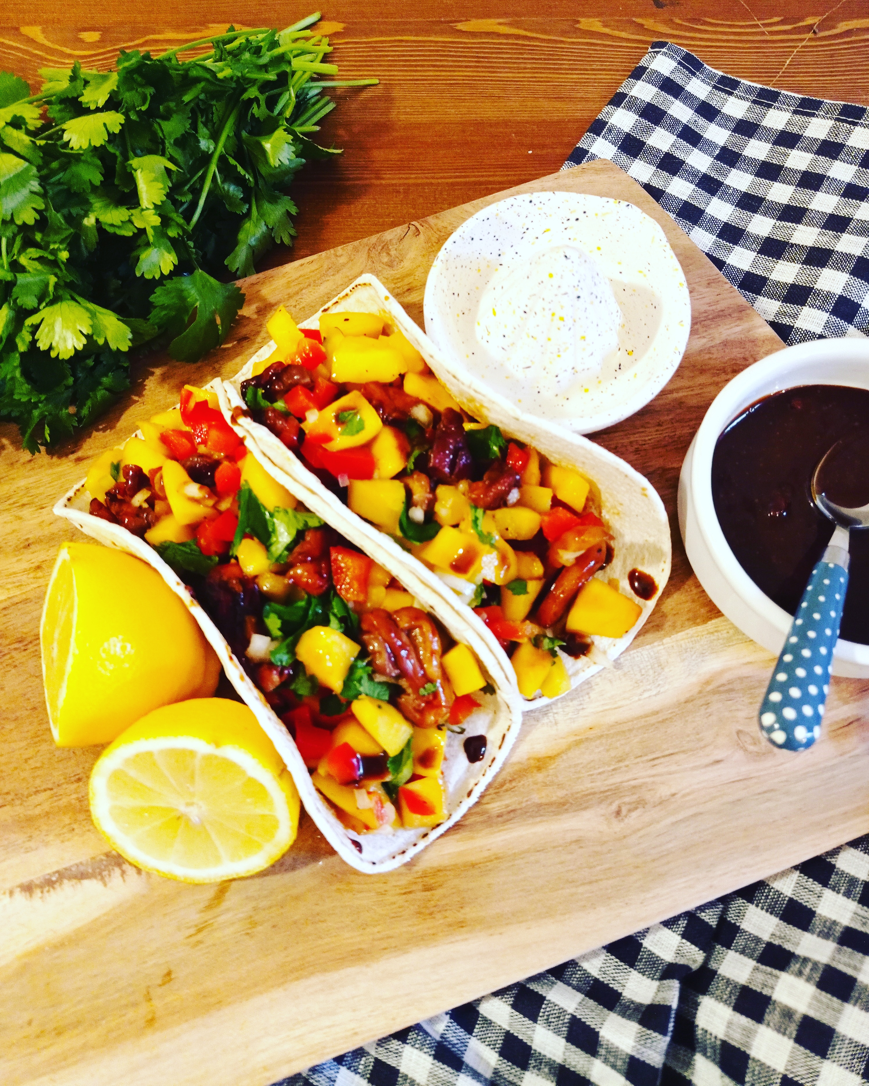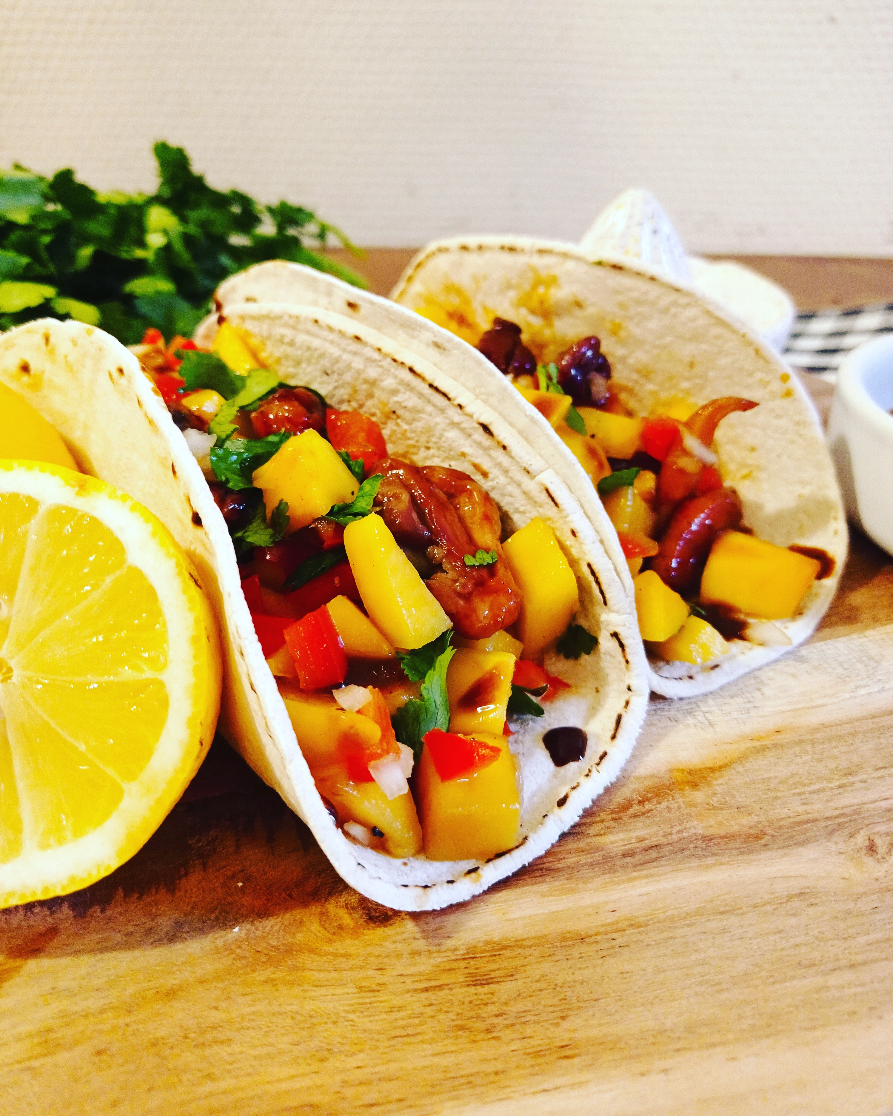 En attendant le printemps, je vous propose un petit tour au Mexique avec une recette très conviviale de tacos revisités en version sucré-salé.