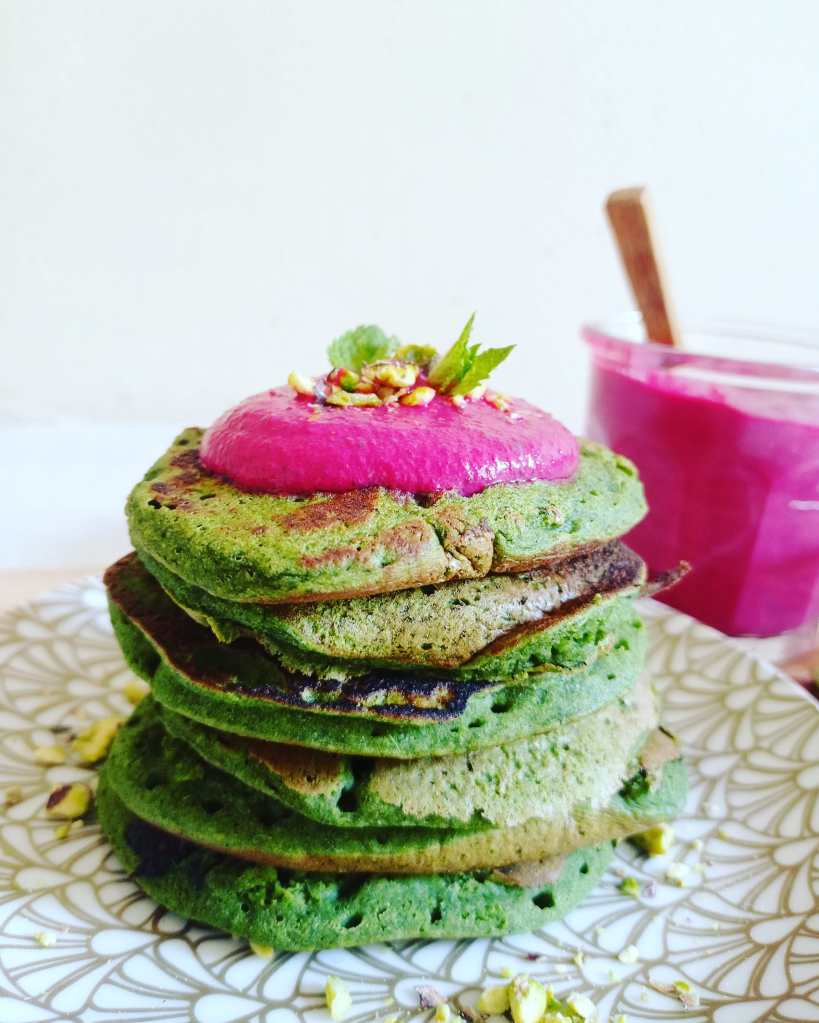 J’aime beaucoup tes pancakes tout verts ! C’est sympa et ça change. Le contraste avec la sauce à la betterave est très joli.