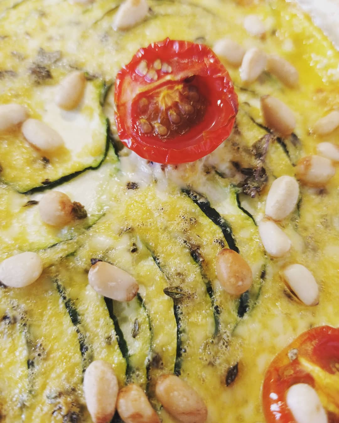- Battez les oeufs avec le tofu soyeux, ajoutez au goût la fleur de sel et le thym, versez l’appareil sur les courgettes