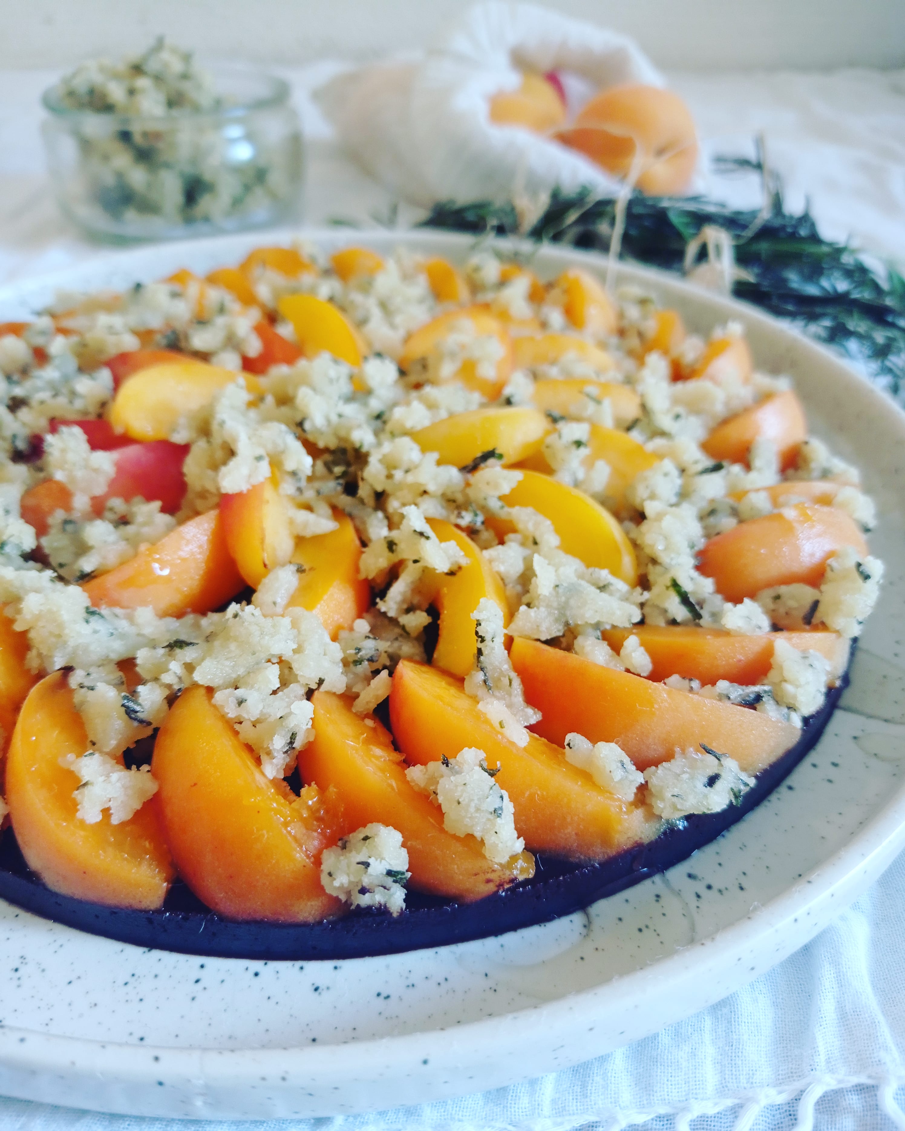 • Coupez les abricots en fins quartiers, disposez-les sur la pâte au cacao et parsemez de crumble.