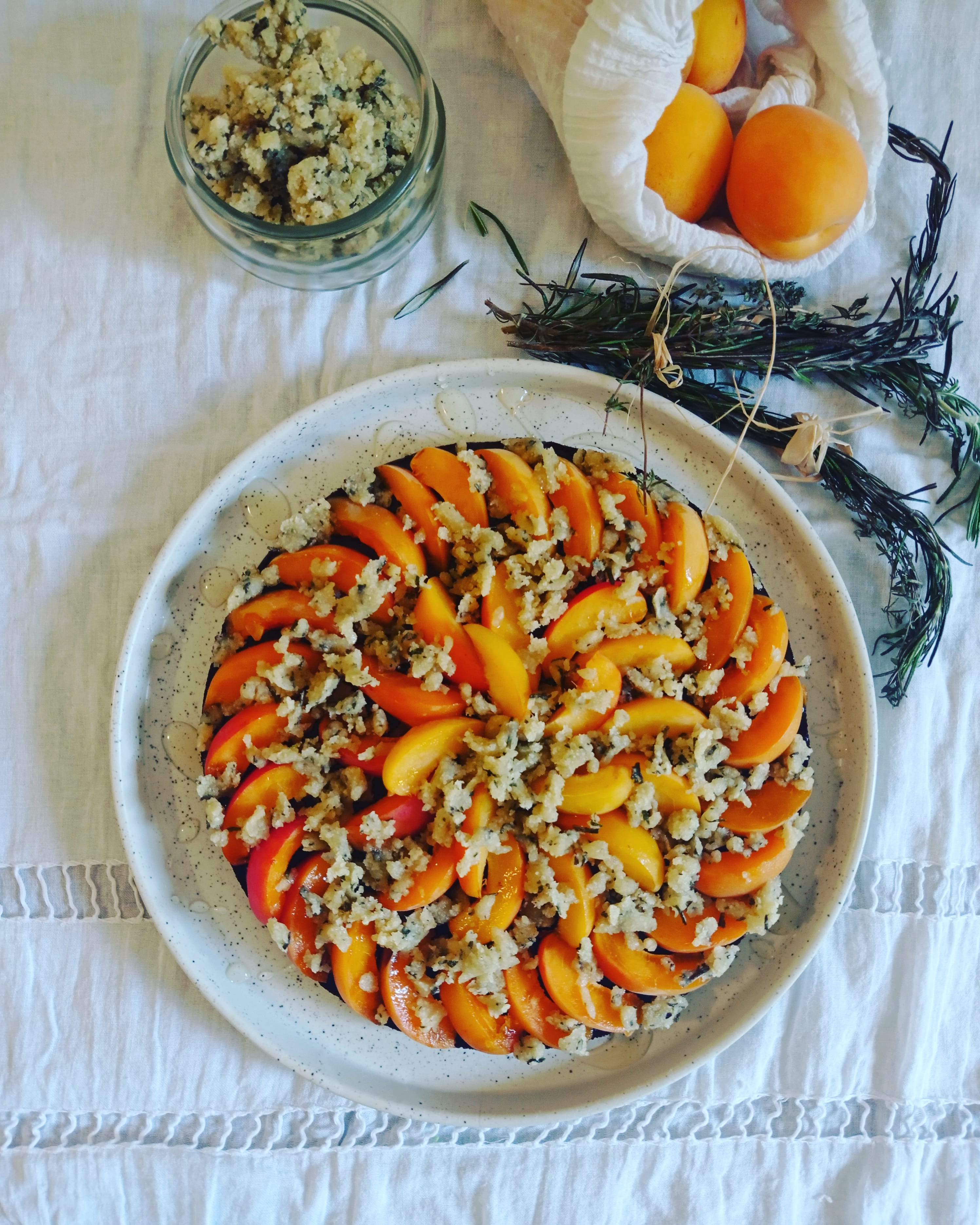 Pour le crumble cru amande-olive-romarin :