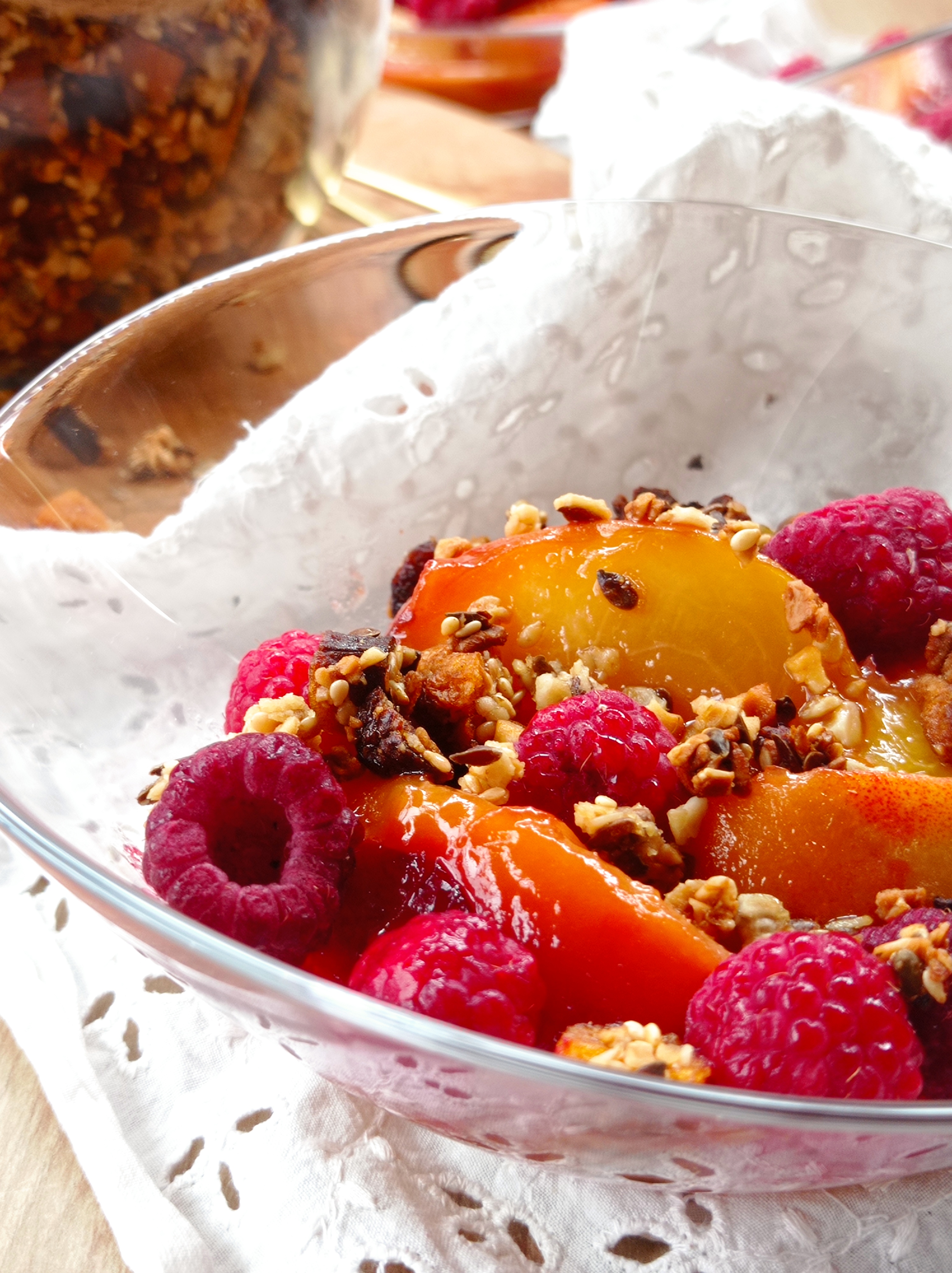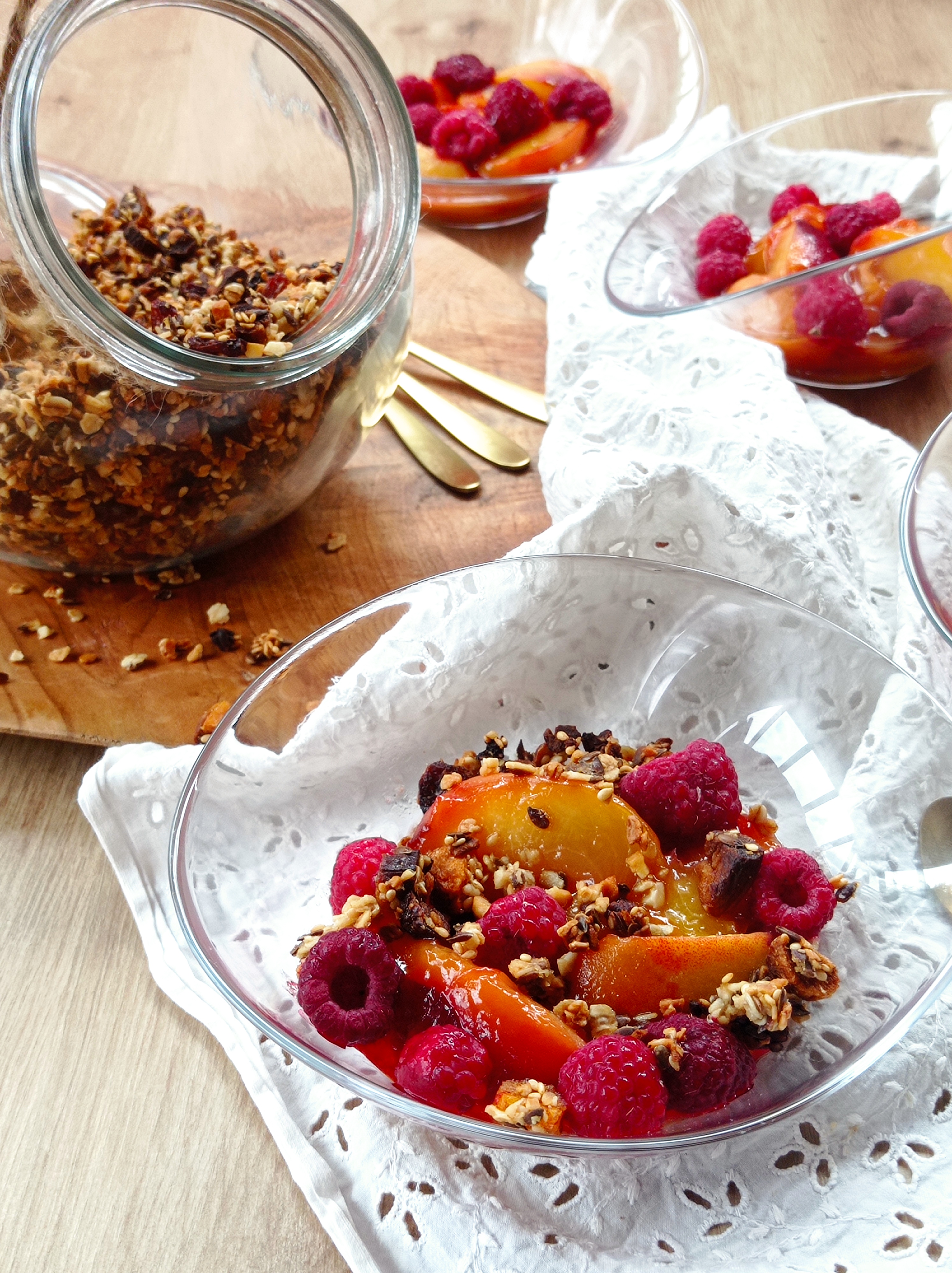 Pour pimper rapidement (et sans avoir à allumer le four à condition que votre granola soit déjà prêt^^) une simple corbeille de fruits, je vous propose ces délicieuses coupelles mi tièdes – mi froides, mi fondantes – mi croustillantes, et où la douceur des pêches et du miel viennent rencontrer la subtile acidité des framboises. Une merveille pour les papilles !