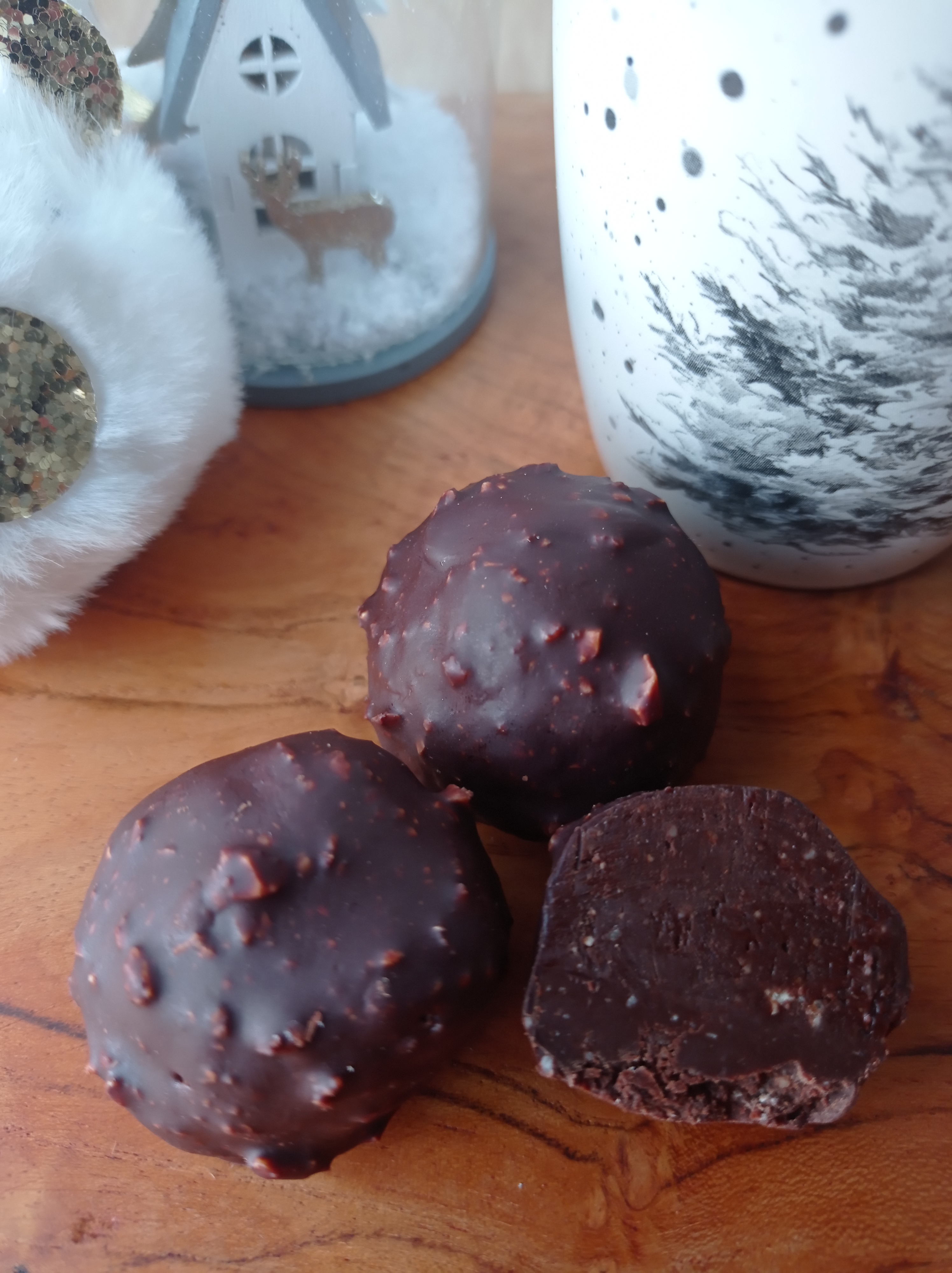 - Formez des boules avec la 1ère préparation puis plongez-les dans le mélange chocolat fondu-noisettes concassées pour les enrober.