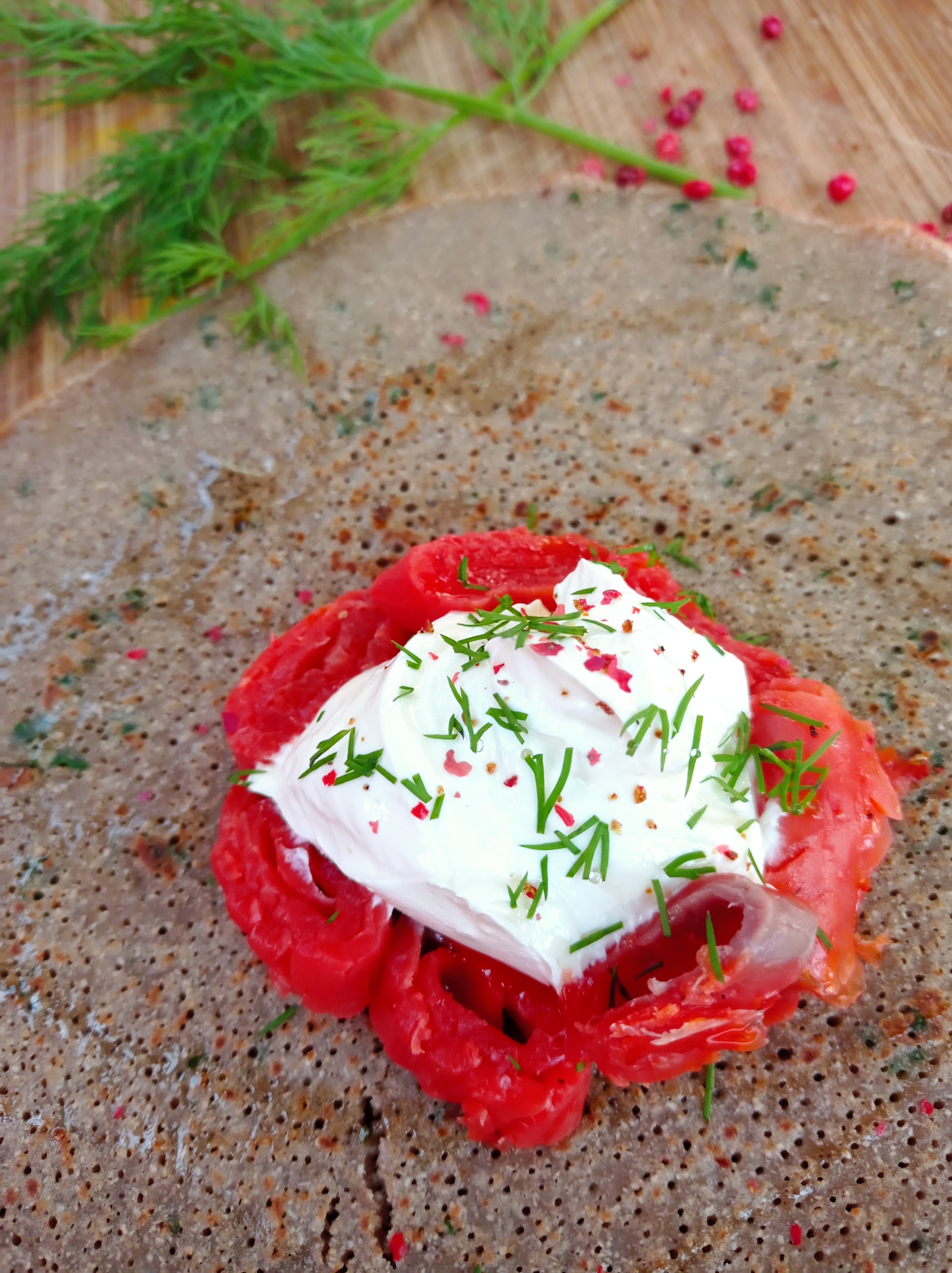 Aumônières de crêpes au sarrasin, chèvre frais et saumon