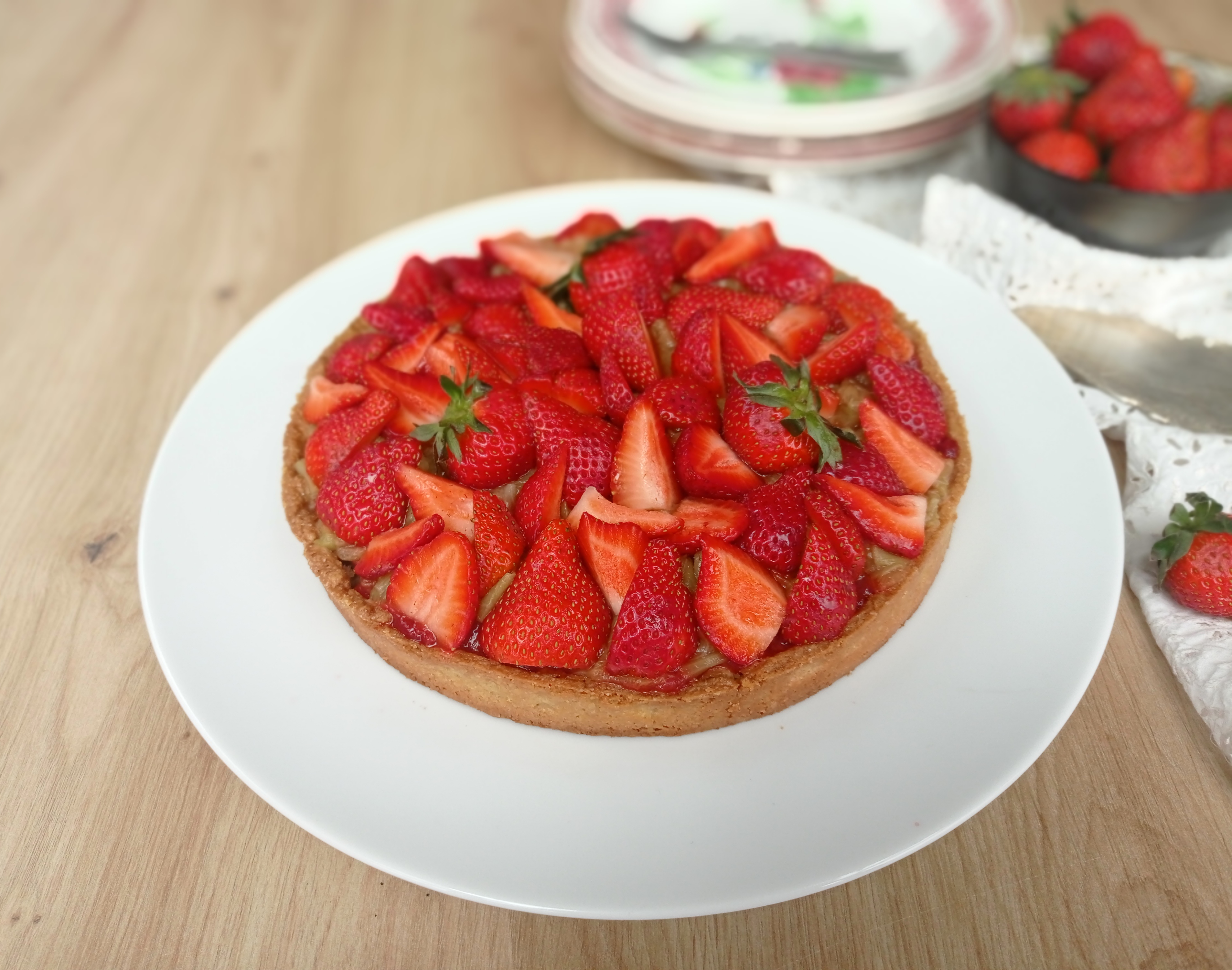 Avant que la saison des fraises et de la rhubarbe ne s’achève, je vous invite à déguster cette tarte délicieusement riche en fruits et en saveurs de début d’été.