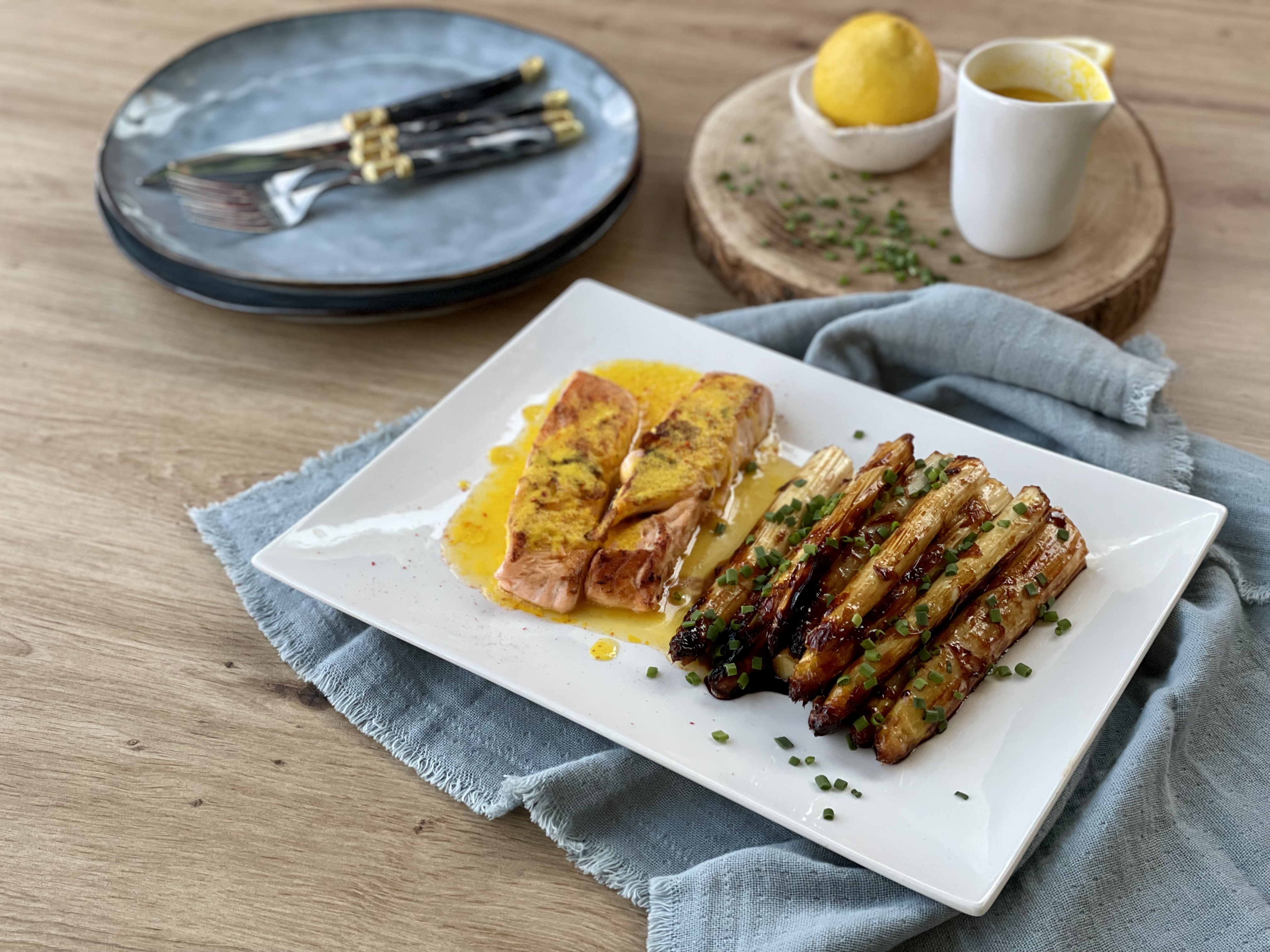 - Dressez sur un plat les pavés de saumon nappés de sauce ainsi que les asperges parsemées de ciboulette finement ciselée. Servez aussitôt.