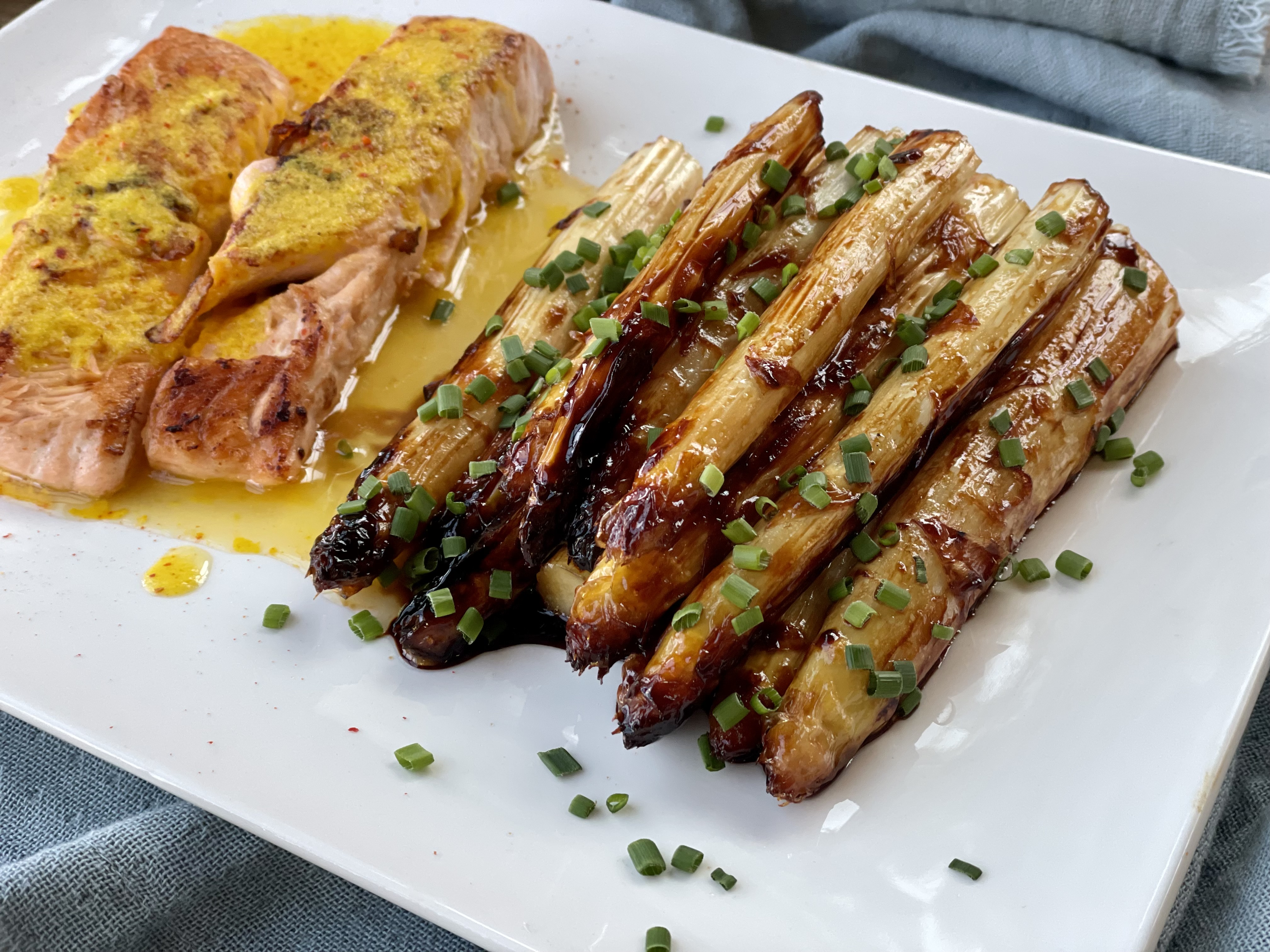 - Avant de servir, faites revenir les asperges dans leur marinade dans une poêle sur feu moyen pendant +/- 10 minutes jusqu’à une légère caramélisation, en les retournant régulièrement.