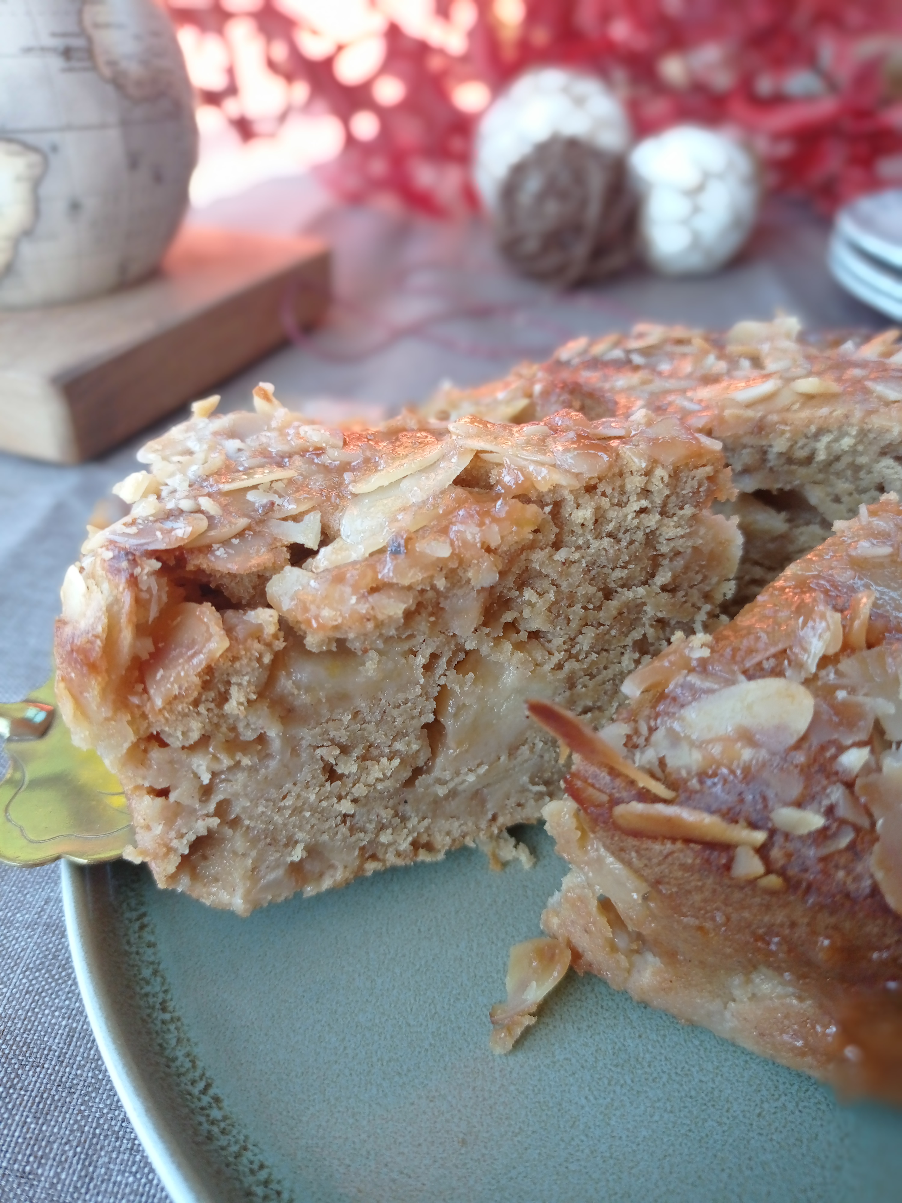 L’utilisation du babeurre apporte tout son moelleux à ce gâteau rehaussé de cannelle, épice qui matche parfaitement avec les pommes. Le nappage à la gelée de coing apporte une touche gourmande supplémentaire tout en protégeant le gâteau et en lui apportant de la brillance. Les amandes effilées apportent la petite note croquante.
