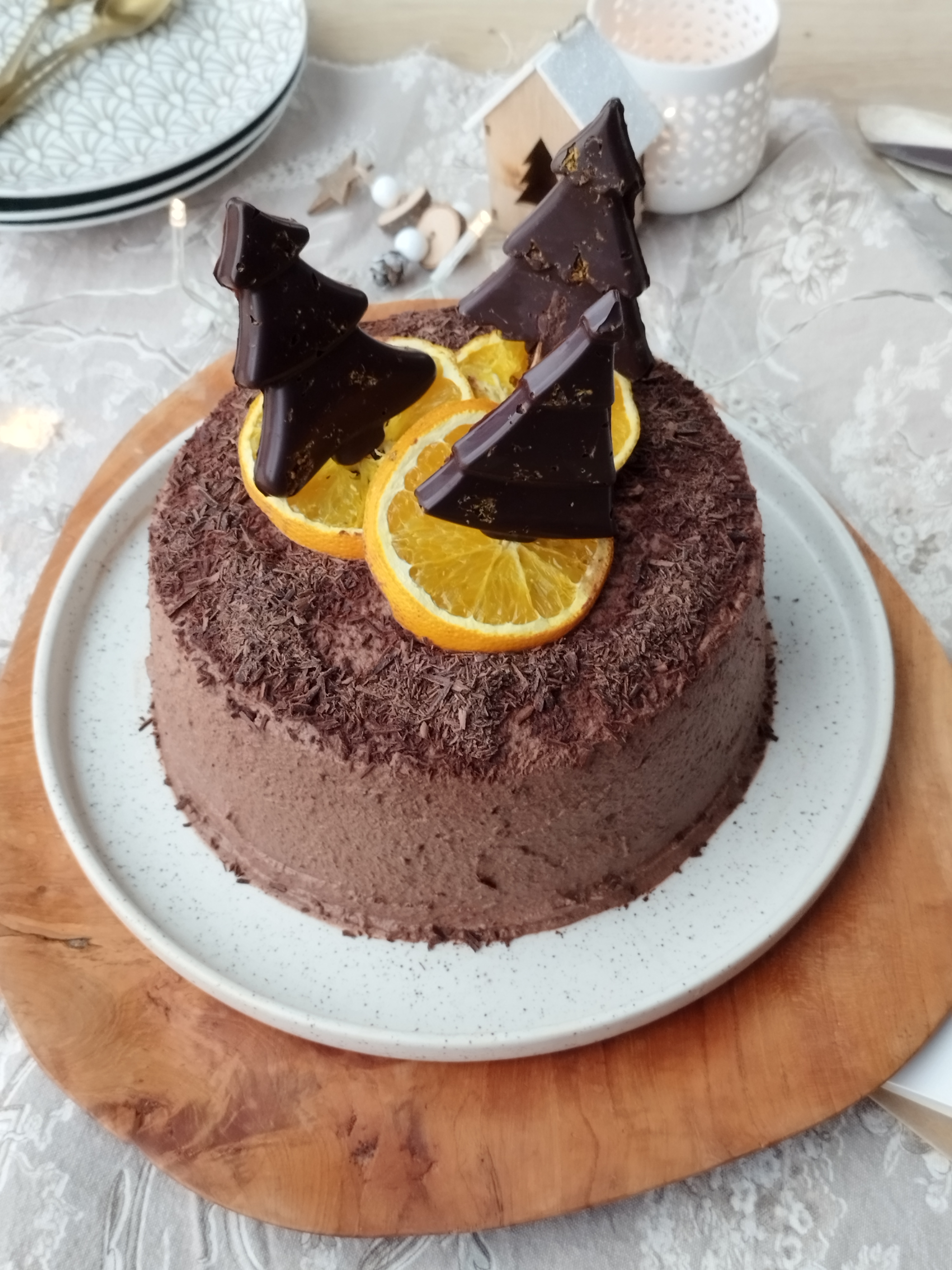 - Décorez selon vos envies (ici du chocolat râpé, rondelles d’orange déshydratées et des sapins en chocolat noir saupoudrés de zestes d’orange).